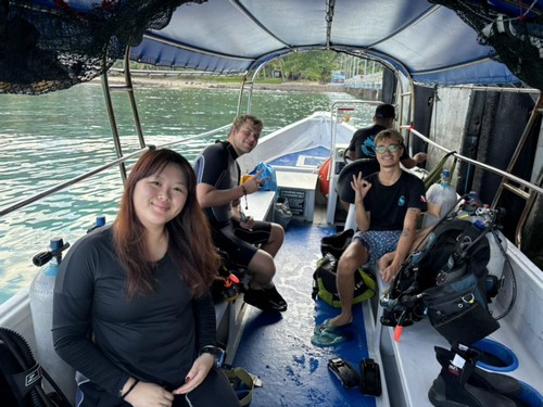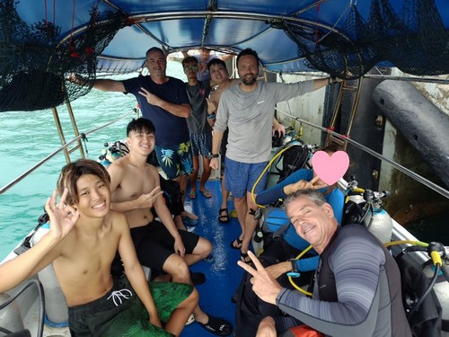 講習最終日はファンダイブの皆さんも一緒に、ボートに乗って出発!無事に講習修了!おめでとうございます